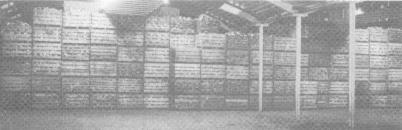 Row upon row of 1 ton boxes being piling up inside storage as harvest pace gathers momentum. Wide open floor space with only a few supports allows easy maneuvering of lift trucks that handle boxes. |